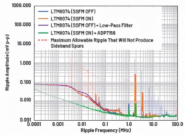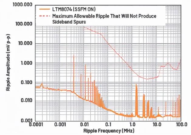 图5.为VDDA_1P8电源轨供电的LTM8074(SSFM开启)的输出噪声频谱,以及该电源轨允许的最大纹波。
