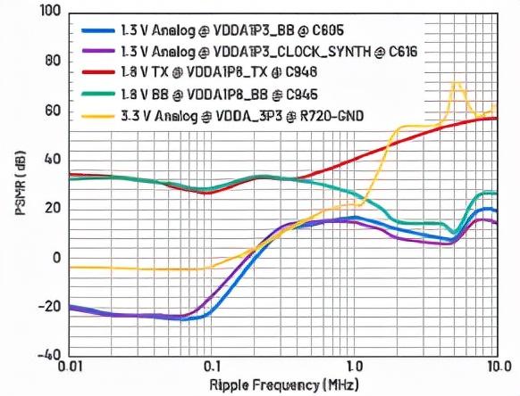 VDDA_1P8电源轨在收发器板上分为两个分支:VDDA1P8_TX和VDDA1P8_BB。VDDA1P8_TX电源轨在100 kHz时达到最小PSMR,约为27 dB,对应于100kHz纹波的63.25 mV p-p,产生2.77 mV p-p的调制杂散。VDDA1P8_BB在5 MHz纹波频率时测量约11 dB的最小值,相当于0.136 mV p-p的注入纹波产生的0.038 mV p-p杂散。