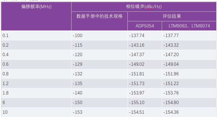 两个备选配置的结果符合>6 dB裕量的噪声规格:未使能SSFM的LTM8074加上LC滤波器,以及使能SSFM的LTM8074加上LDO后置稳压器。虽然二者均以充足的裕量满足了要求,但LDO后置稳压器解决方案在此更有优势。这是因为VDDA_3P3电源轨还提供3P3V_CLK1时钟电源,因此1/f噪声的减少相对更重要——如果不予处理,这里的噪声可以转化为本振中的相位抖动。