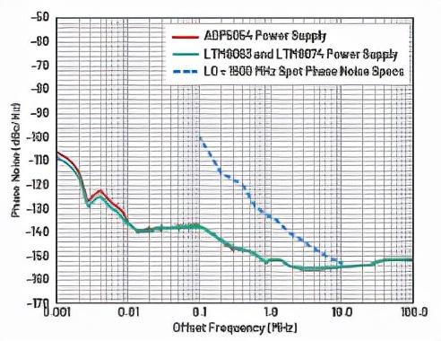 图8.ADP5054与µModule器件的PSU之间的AD9378相位噪声性能比较,