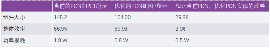 表1显示了优化PDN与标准PDN的对比。组件大小减小29.8%,效率从66.9%提高到69.9%,整体节能0.5 W。