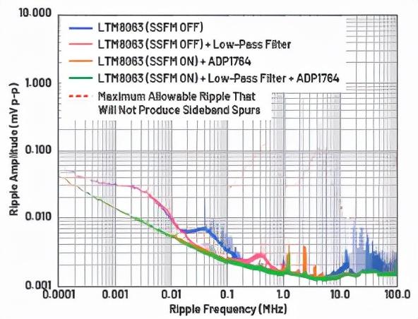 如果仅增加LC滤波器(无LDO稳压器),则开关频率处的纹波刚刚达到最大允许的纹波——可能没有足够的设计裕量来确保收发器性能最佳。增加ADP1764 LDO后置稳压器并开启LTM8063的展频模式,可以降低整个频谱上的基波开关纹波幅度及其谐波,以及SSFM在1/f区域中引起的噪声峰值。 通过开启SSFM并增加LDO稳压器和LC滤波器,可以实现最佳效果,降低开关动作所引起的剩余噪声,给最大允许纹波留下约18 dB的裕量。