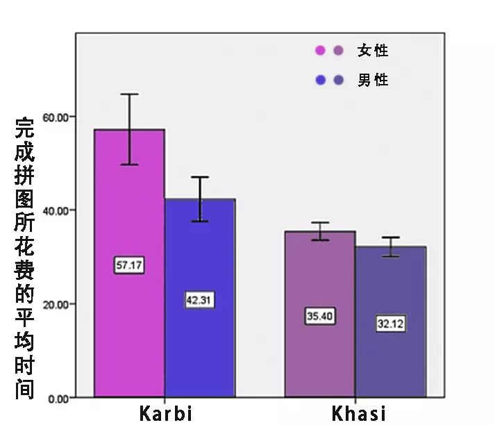 实验的部分结果如上图所示。我们可以很清晰地看到:1.母系社会中参试者完成拼图的时间均少于父系社会,整体上似乎有更强的空间能力;2.母系社会中男性和女性完成拼图的时间差异,也小于父系社会中巨大的性别差距。