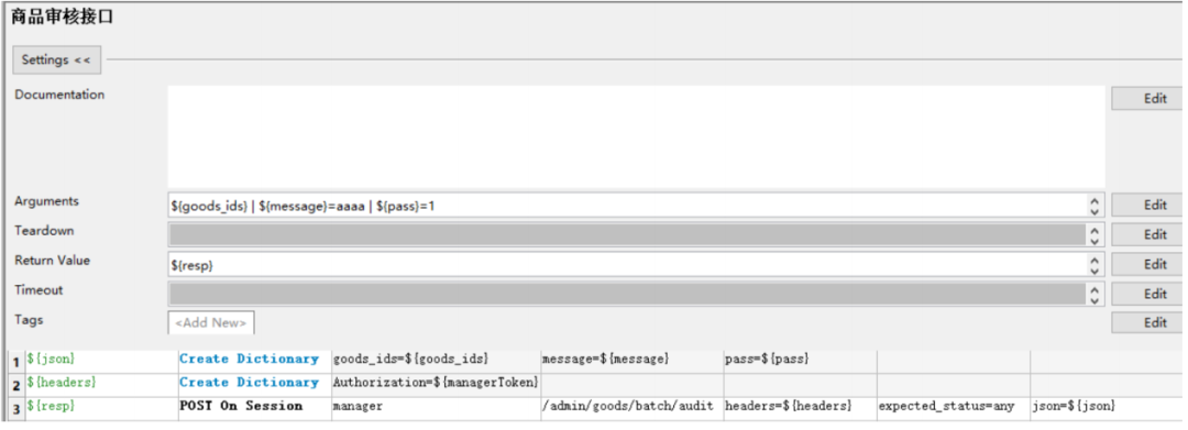 在[接口默认参数]目录中创建一个 评论.json文件,内容写所有参数的默认值,其中写xxxx代表这个是动态数据,必须每次都由调用方传递 关键字入参的含义: ${order_sn}、${sku_id}都是必传参数,${other}给了一个默认值,表示可以不传,如果用户需要针对json参数里除了order_sn和sku_id的参数进行测试时就要以${other}代表,${other}的传递规则是字符串形式的json格式字符串,key必须是jsonpath表 达式,value是要替换的新值例如: 针对替换json串中的特定字段封装一个自定义关键字 ,在业务关键字.robot下创建一个用户自定义关键字如下,业务关键字需要导入JSONLibrary 脚本解释: 第一行:读取 [接口默认参数] 目录下的评论.json文件,得到默认json参数 第二/三行:把用户传入的order_sn和sku_id更新到${comment_info}中去 第四行:判断${other}不等于default,说明用户传了其他数据,那么${other}转换成json第五行:判断${other不等于default},调用[替换json数据]关键字替换并且返回数据02