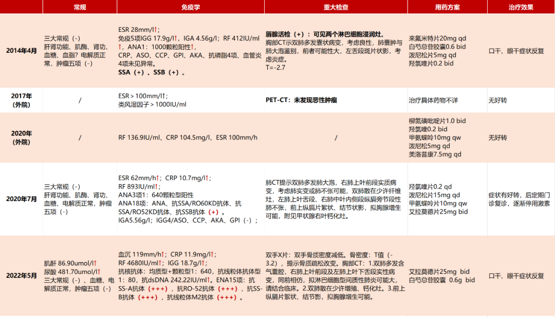 患者目前诊断仍为“干燥综合征“ ,多年诊治经过整理如下表所示。