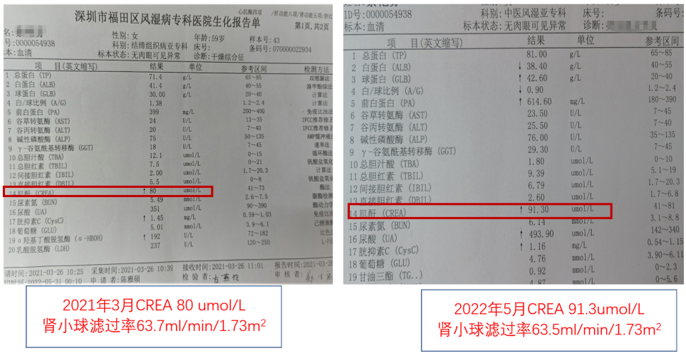 5、2021年3月开始,血肌酐轻度高,监测半年无变化,今年5月出现肌酐91μmol/L。