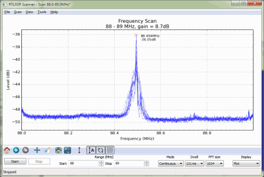 RTLSDR扫描仪是一个基于简单的跨平台的宽带频谱分析仪。它可以扫描一个任意大的频率带宽。扫描仪也有一个自动校准功能,可以帮助找到接收机的PPM补偿。新版本也有GPS功能,它允许您将硬件GPS接收器接到软件,做信号映射的实验。
