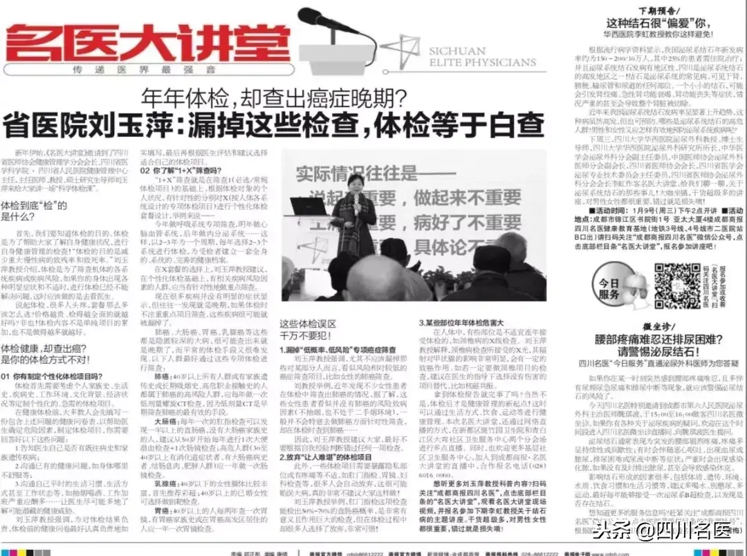 新年伊始,《名医大讲堂》邀请到了四川省医师协会健康管理学分会会长、四川省医学科学院 · 四川省人民医院健康管理中心主任,主任医师、教授、硕士研究生导师刘玉萍 来给大家讲一场“科学体检课”。
