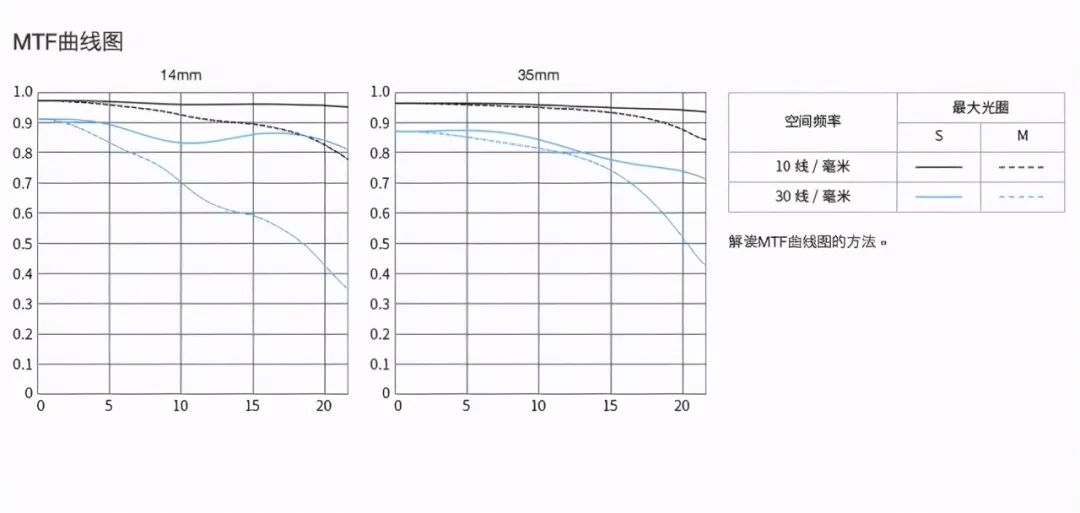 根据官方给出的无限远MTF曲线看,镜头14mm以及35mm端最大光圈F4的中心锐度相当不错,同时边缘锐度也与中心的差距并不大,属于优秀水平,其中14mm的边缘更好一些。