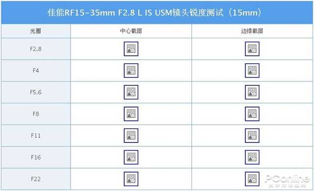 本环节测试使用佳能EOS R机身搭配RF15-35mm F2.8 L IS USM镜头,关闭一切机内优化设置,ISO感光度为100,使用Av档拍摄各个光圈档,截取中心和边缘进行锐度测试,结果如下: