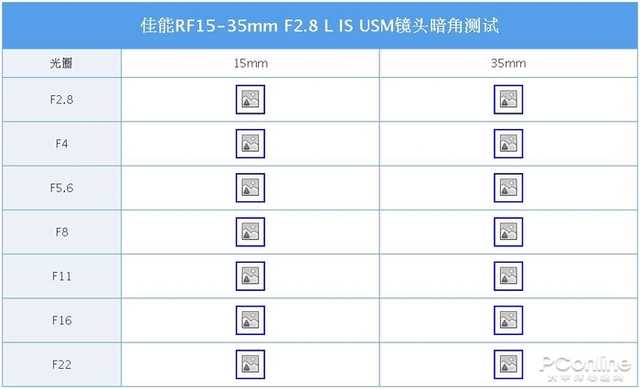 14mm端时,F4下的暗角较明显;从F5.6开始暗角情况有所减轻;F8时暗角已较为轻微。35mm端