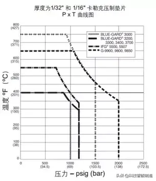压力垫片必须能够承受最大压力,这种最大压力或许是试验压力,它可能是正常工作压力的1.25-1.5倍。对于非金属材料的垫片,其最大压力还会与最高工作温度有关系,通常最高温度乘以最高压力的值(即PxT值)有一极限值,所以在选择其最大工作压力时,还要考虑垫片能承受的最大PxT值。下图为GARLOCK常见压制垫片的PxT值图,不同型式的垫片所能够承受的压力也是不一样的。