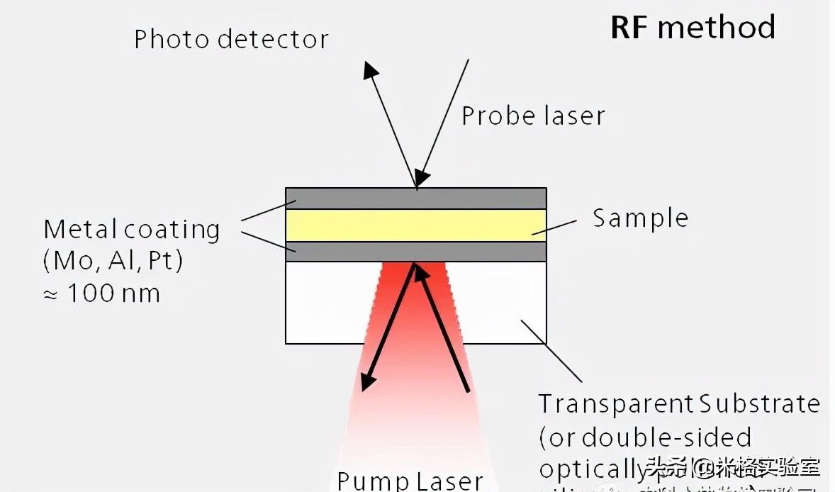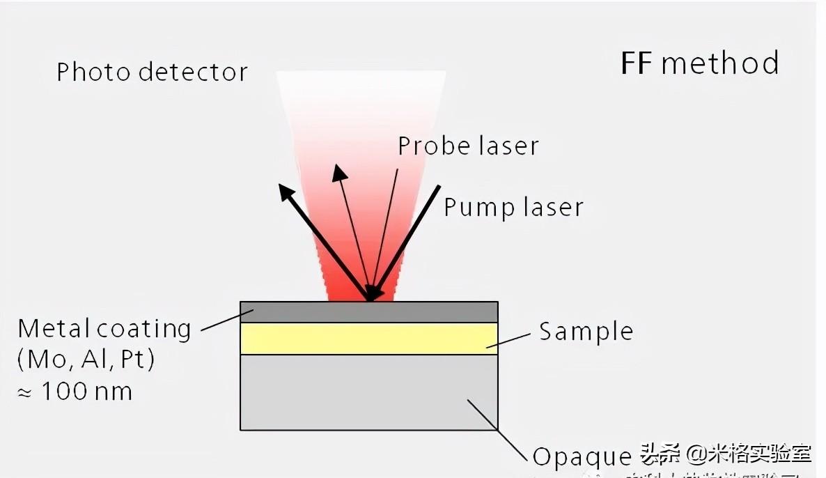 纳米级薄层与薄膜的热透过时间极短,传统的激光闪射法(LFA)使用红外测温,采样频率相对较低,已不足以有效地捕捉纳米级薄膜的传热过程。超快速激光闪射法可以克服经典的激光闪射法局限,其典型模式为后部加热/前部探测方法。
