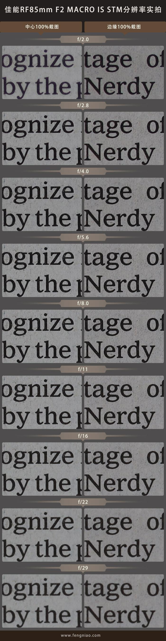 我们知道以往定焦镜头在画质方面都有着不俗的表现,无论是此前我评测的RF35mm f/1.8 MACRO IS STM,还是RF85mm f/1.2的那两支镜头,画质表现都非常突出,那么这支镜头在实拍画质上的表现到底如何呢?我选择关闭机内一切镜头补偿,并采用ISO 100,逐级调整光圈并100%截取画面中心和边缘,来看看这支镜头的实际表现。