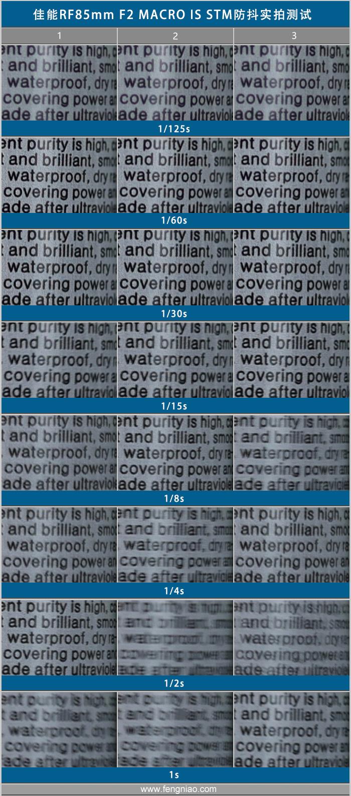 在手持测试防抖效果时,我采用站立姿势进行拍摄,其中每挡快门速度单张拍摄,并且只拍摄3张。因为手持稳定性因人而异,防抖效果的展示大家作为参照即可。根据实际的拍摄情况,我们发现在1/2s快门速度时,也能获得比较清晰的画面,而在1s的快门速度时,则已经有两张照片出现了因抖动而造成的画面模糊现象,因此佳能RF85mm F2 MACRO IS STM这支镜头的防抖效果还是非常不错的。
