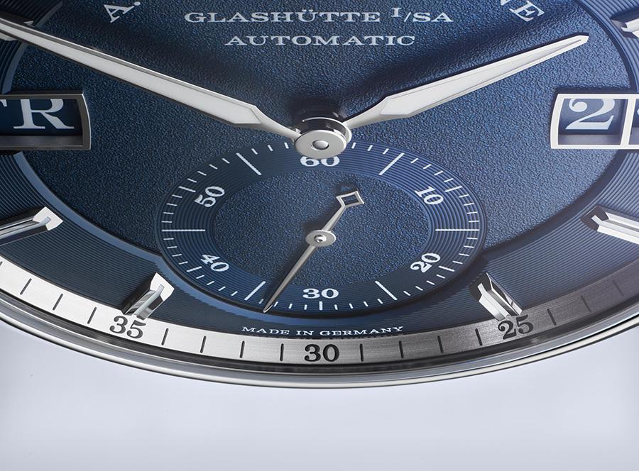 ODYSSEUS 的表盘为暗蓝色,材质是黄铜,采用了多层设计,斜面银白色外圈上印有分钟刻度,小时刻度则是以 18K 白色 K 金凹槽棒形设计呈现,柳叶形时针和分针采用的也是 18K 白色 K 金,并有夜光功能。另外,6 点钟位置是一个小秒盘,3 点钟位置有经典的朗格大日历双视窗,9 点钟位置则是相同大小的星期显示。腕表配备了设有折叠表扣的精钢表带。朗格还专门为这款腕表打造了全新自动上链机芯——L155.1 DATOMATIC 机芯。
