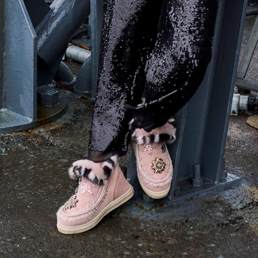 10 月 23 日,mou 介绍了 2019 秋冬的两个全新鞋款系列。其中“魅力冬日”系列鞋款的鞋筒和鞋面使用了动物绒毛,包括灰粉色和黑白灰拼色设计的单品等,主打款还装饰了星星钻饰。“活力冬日”系列则采用了亮眼的配色和金属光泽感的材质,包括凤梨黄和金属紫等设计大胆的单品。款式方面,这次两个系列里都有多款 Eskimo Sneaker 爱斯基摩迷你休闲鞋型,采用了羊皮毛一体材质,鞋面有手工钩针细节,后跟有加固设计,搭配了防滑耐磨的橡胶鞋底。