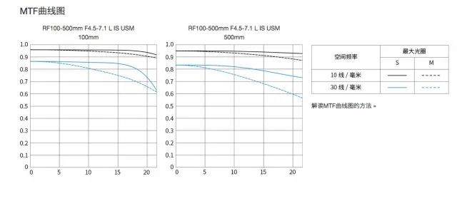 从官方给出的MTF曲线来看,无论是100mm还是500mm端的中心锐度表现良好,均可在0.8以上,相对来说100mm端的边缘成像略差。500mm长焦端的边缘成像则更接近于中心的水平。