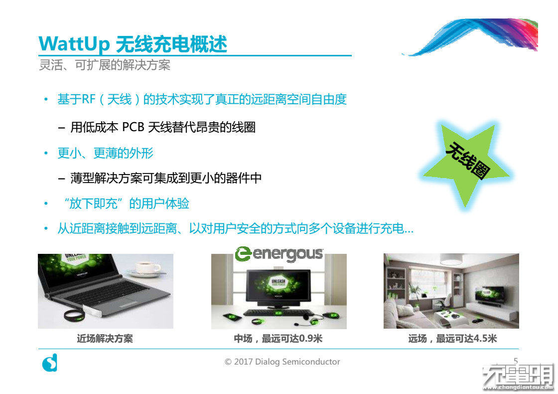 近日,高度集成电源管理、AC/DC电源转换、充电和蓝牙低功耗技术供应商Dialog半导体公司与Energous联合推出了下一代RF无线充电解决方案–WattUp。该技术包括了DA4100功率发射器和DA2200、DA2210无线充电接收器;用小型、低成本的天线替代目前较大的线圈,并能够在4.5米范围内成功采集RF能量,实现对设备的充电。