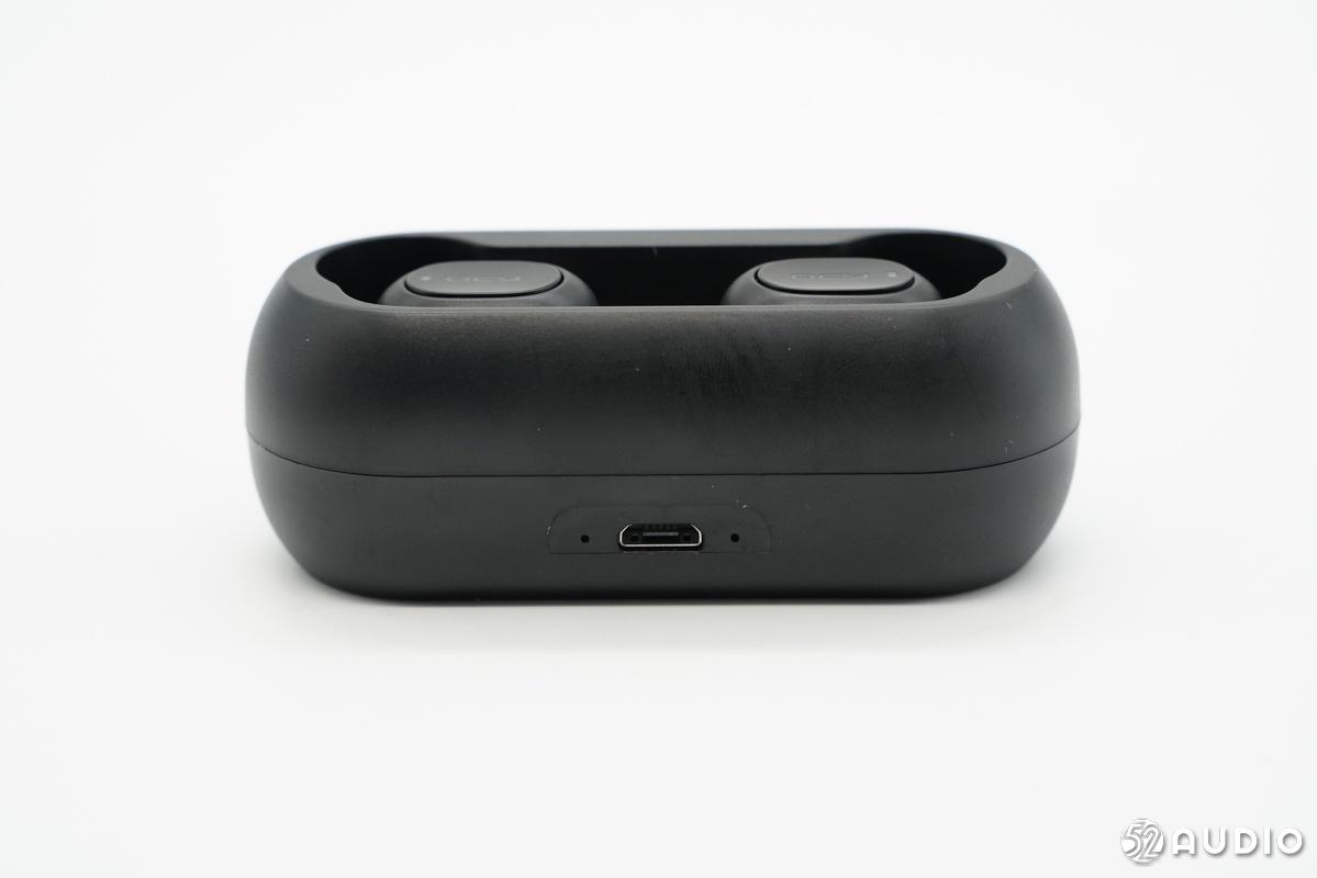 充电盒背面展示,采用Micro-USB充电接口,左右各一个指示灯。