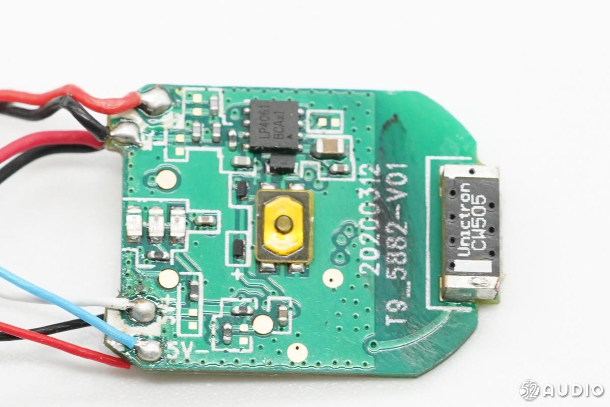 耳机部分,QCY T1C真无线蓝牙耳机搭载了春藤5882蓝牙音频SoC,这是我爱音频网在拆解中首次见到这款芯片。春藤5882支持蓝牙5.0,支持SBC/AAC音频编码,集成BT RF/Analog/PMU/CPU/DSP/Flash/RAM等单元,使得外围电路非常精简。QCY T1C耳机支持按键控制,单麦克风用于通话,采用咏业科技的贴片蓝牙天线传输数据; 电池来自弘捷新能源,容量0.159Wh约43mAh, 主板上有微源LP4061线性充电IC为其充电。