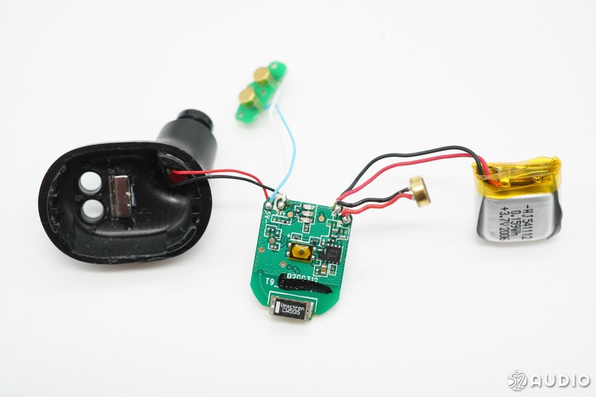 扬声器单元、充电触点、电池和麦克风均通过导线与主板相连。