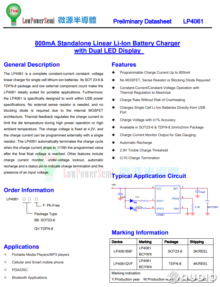 LPS微源半导体LP4061,800mA线性锂离子电池充电器,支持双LED状态指示,外围元件精简,无需采样电阻,2x2mm DFN封装节省面积。