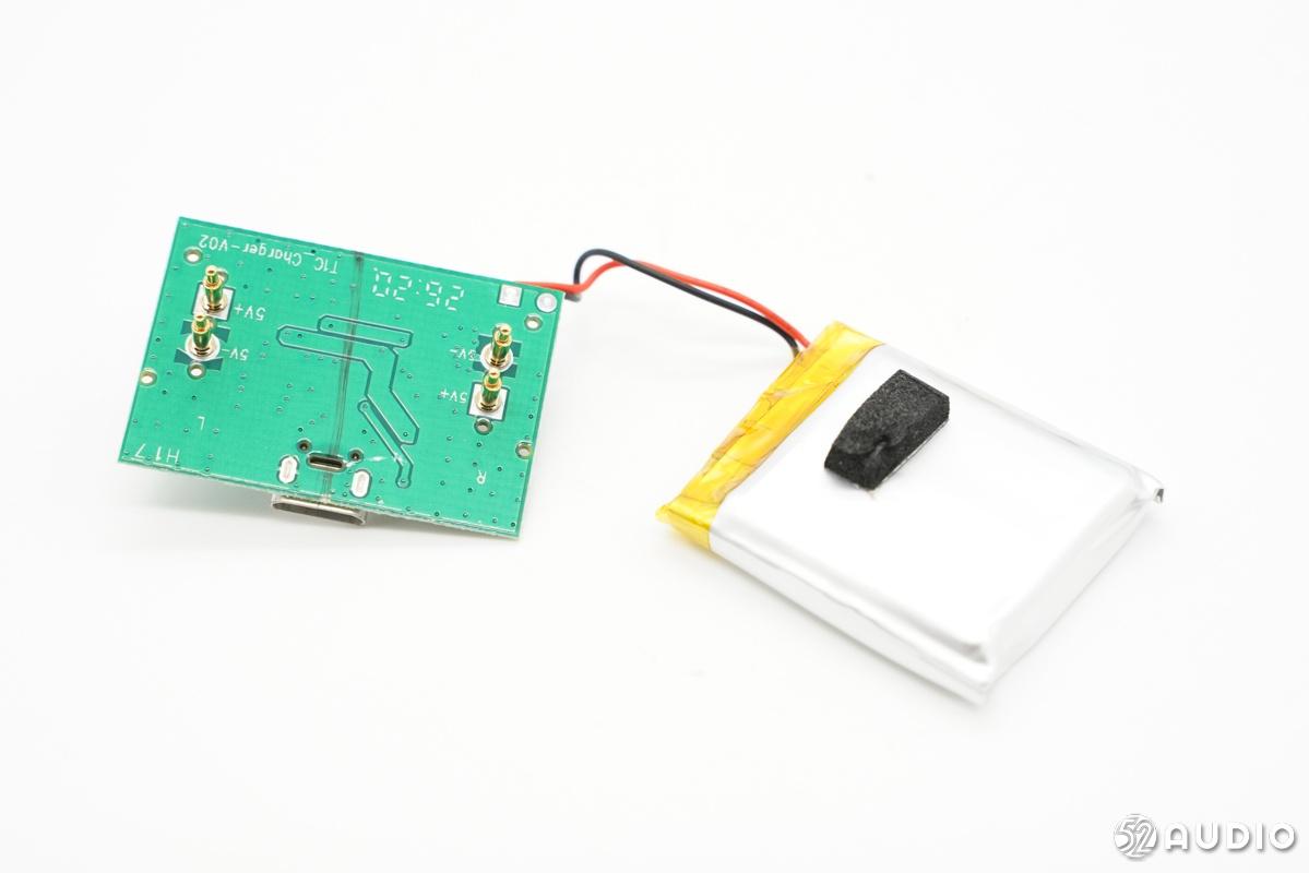 充电仓内部电路展示,电池与壳体之间有一块缓震泡棉,主板外侧是给耳机充电的Pogo Pin,电路集中在主板另一侧。