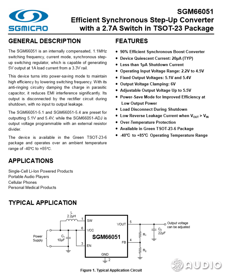圣邦微 SGM66051 高效率同步整流升压转换器,将内置电池输出的能量升压为耳机充电,5.1V固定输出。