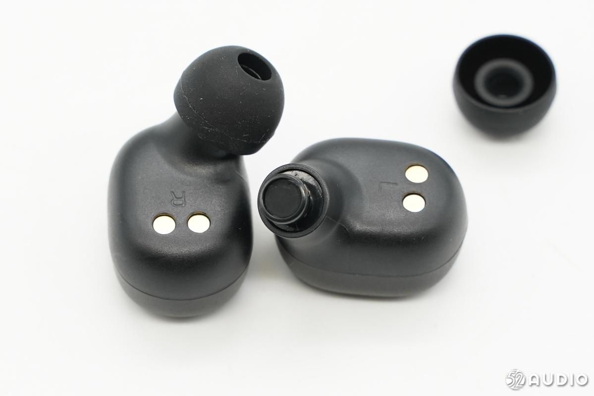 下面我们再来拆解QCY T1C的耳机,豆式入耳设计,QCY Logo处为实体按键,旁边有一个工作指示灯,耳机的充电触点有保护贴。