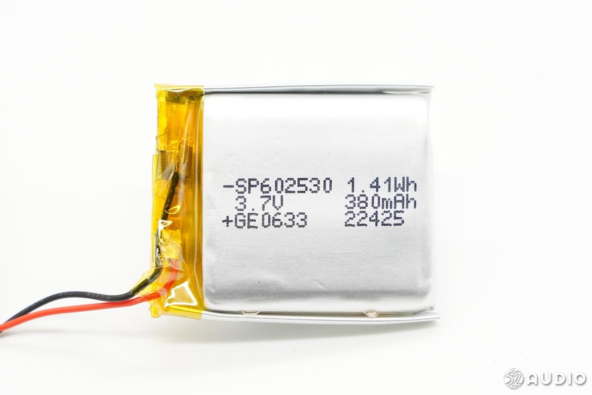 充电仓的软包电池来自超聚电池,型号SP602530,额定电压3.7V,额定容量380mAh/1.41Wh。