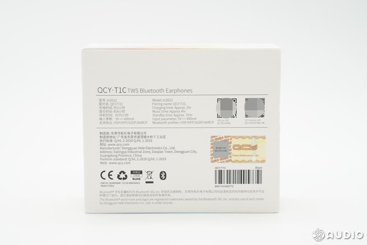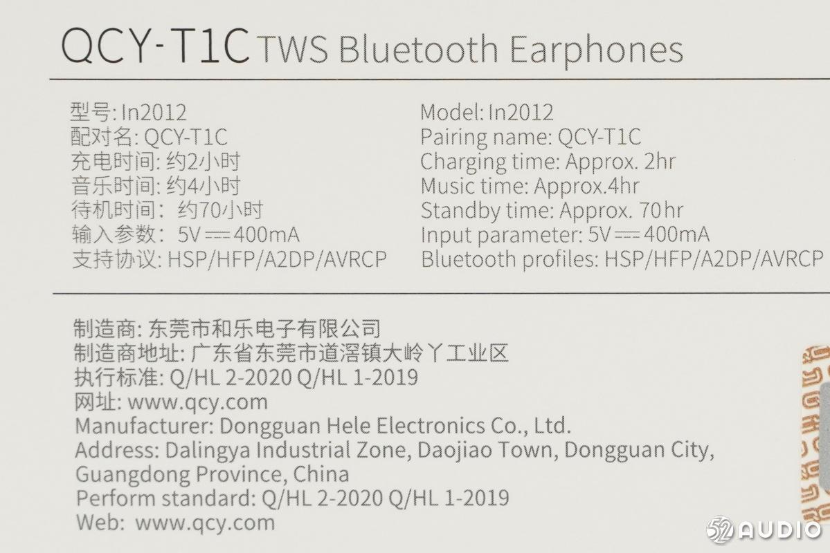 QCY T1C TWS蓝牙耳机,型号In2012,充电时间约2小时,音乐播放时间约4小时,输入参数5V⎓400mA,支持协议:HSP/HFP/A2DP/AVRCP,制造商:东莞市和乐电子有限公司。