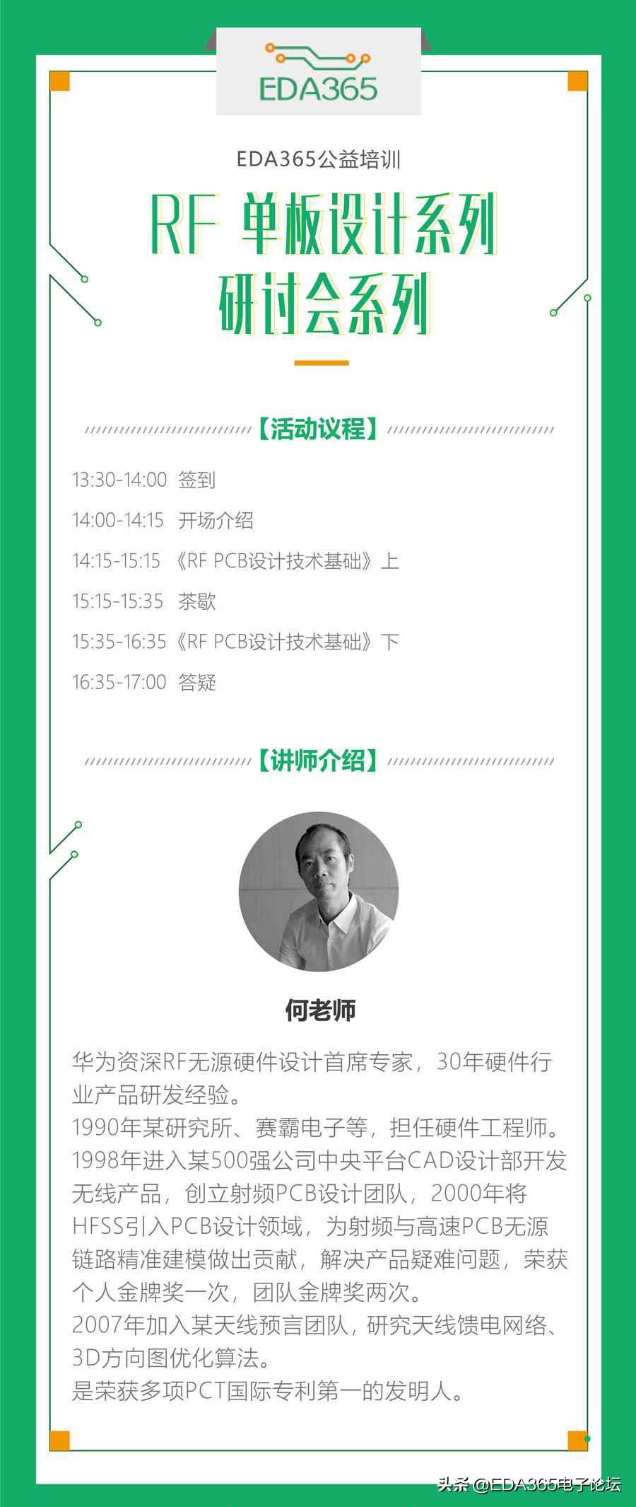 一、主题:EDA365公益培训---产品研发必修课-RF 单板设计系列研讨会