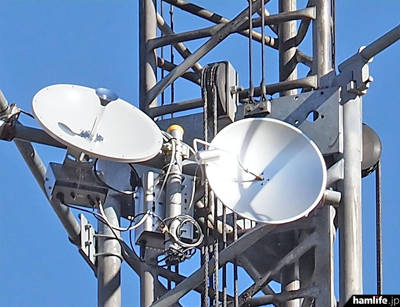 51米高的曲柄塔的中间部分,IC-905射频单元安装在两个抛物面天线之间,通过LAN电缆连接到2号楼一楼的IC-905控制器,大约100米。就在左边的抛物面天线后面是10GHz的装置。