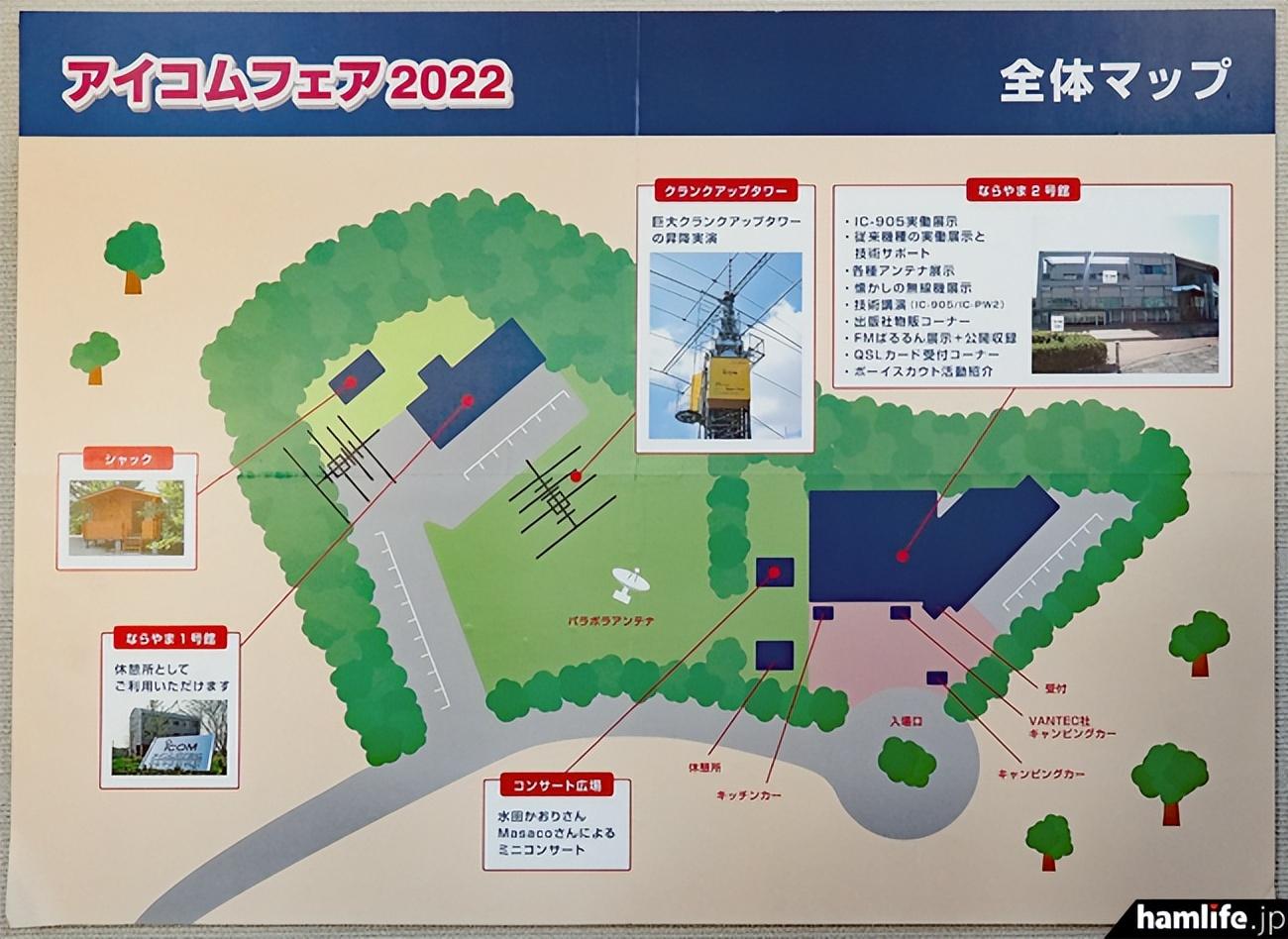 活动在成山2号楼一楼(IC-905、IC-PW2和主要产品展示、赞助商展览和商品销售)、二楼(讲座、合作俱乐部展示、怀旧无线电设备、童子军活动介绍)、2号楼前的露营车和厨房车展示、户外音乐会广场、成山1号楼进行。1号建筑",一个曲柄塔和一个休息区。