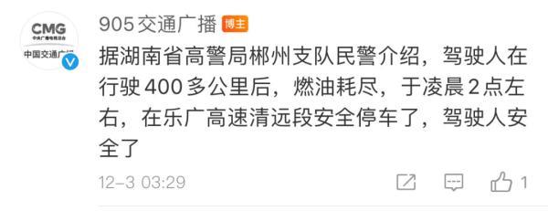 3日0时16分,@905交通广播 发布消息:“有一辆湘A牌号的白色越野车,因定速巡航无法解除,导致车辆失控,目前正行驶在G4京港澳高速郴州段往广东方向,请沿线驾驶员为其让出超车道。”