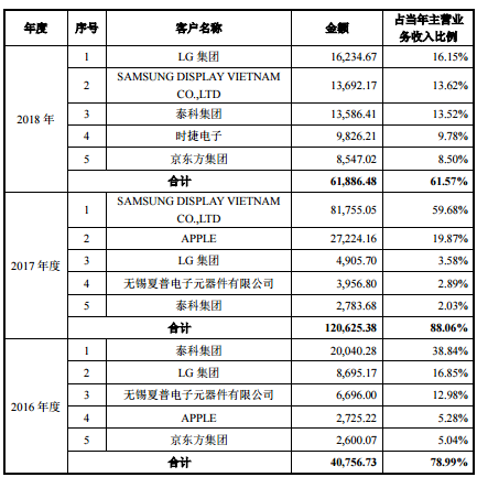 据了解,华兴源创的前五大客户,除苹果外,还有三星、LG集团等。招股书显示,2016-2018年,华兴源创对前五大客户的销售收入分别为4.08亿元、12.06亿元、6.19亿元,占营收的比重分别为78.99%、88.06%、61.57%。