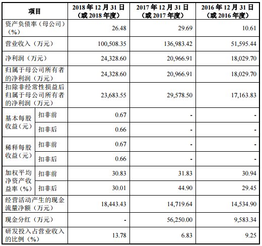 的确,对大客户的依赖导致了华兴源创的经营业绩出现波动。招股书显示,2016-2018年,华兴源创实现营业收入分别为5.16亿元、13.70亿元和10.05亿元;归母净利润分别为1.8亿元、2.10亿元和2.43亿元;扣非后净利润分别为1.72亿元、2.96亿元和2.37亿元;经营活动产生的现金流量净额分别为1.45亿元、1.47亿元和1.84亿元。可以看到,2018年华兴源创的营收、扣非后净利润同比分别下滑26.63%、19.93%。