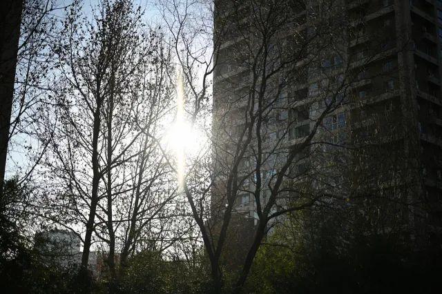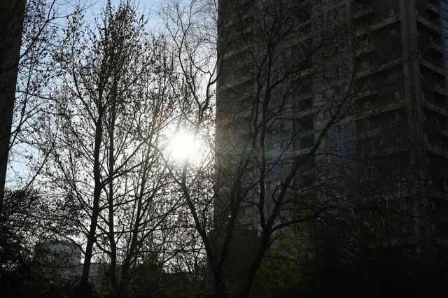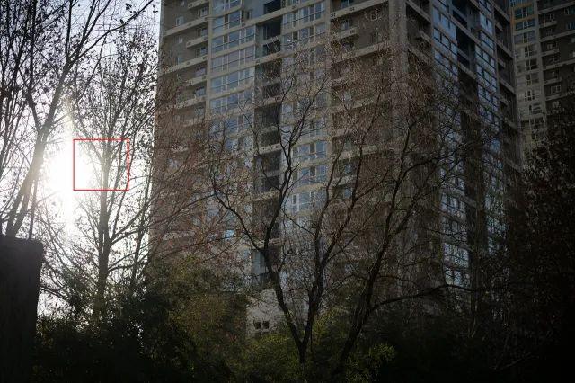 我们拍摄大楼侧面透过树枝的阳光,从实拍来看,这款镜头在全开光圈下的高光处出现纵向呲光;当光圈收至F8时,高光右侧树干部分出现少量鬼影。总的来说,Z 50mm f/1.2 S虽有两种镀膜技术加持,但不能完全杜绝眩光、鬼影的干扰,这种程度的表现算比较不错的。