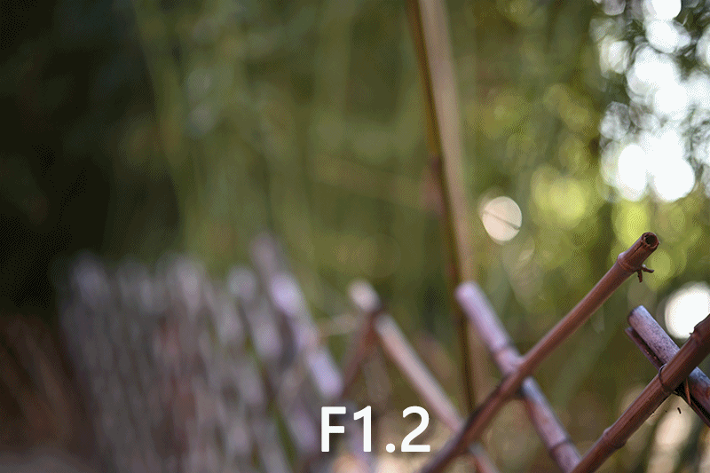第一组测试我们选择拍摄竹栅栏。从实拍来看,在纵深场景中,F1.2最大光圈下具有很强的虚化能力,栅栏之后的栏杆、竹林近乎抹平,过渡非常顺滑,有较明显暗角。光圈缩小到F1.4、F1.8暗角减轻,虚化程度开始下降,竹林和栅栏线条逐渐凸显。