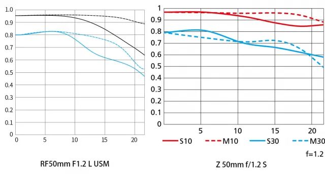 在实测之前我们先看一下纸面实力,笔者对比了Z 50mm f/1.2 S、RF 50mm F1.2 L USM两款镜头官方MTF曲线: