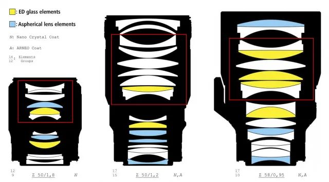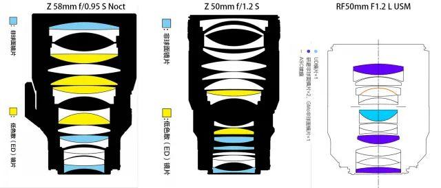 Z 58mm f/0.95 S Noct、Z 50mm f/1.2 S、RF 50mm F1.2 L USM光学结构对比(佳能RF采用高斯结构)