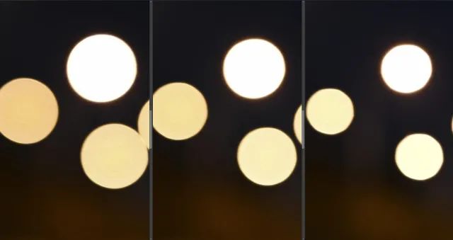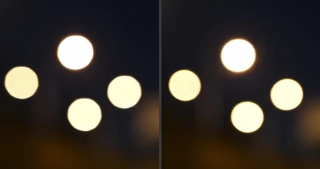 该50mm镜头全开在中心区域的光斑比较圆,而往边缘由于口径蚀的原因,形成橄榄形光斑。光圈收缩F1.4、F1.8边缘光斑逐渐变圆变小。