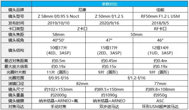 既然尼康、佳能均推出了“50mm f/1.2”无反镜头,再加上Z 58mm f/0.95 S Noct,我们可以对三款镜头进行一番纸面参数对比: