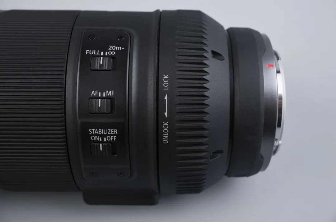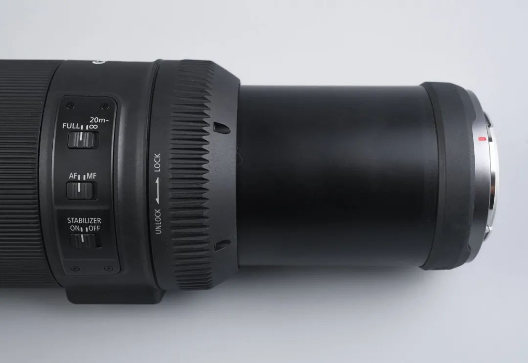 RF800mm F11 IS STM和RF600mm F11 IS STM使用了固定光圈设计以及推拉式结构,最大程度进行“减负“。镜头底部配有镜筒锁,拍摄时,需要先解锁后,向前推出镜筒并再次锁定,此时镜头才会进入拍摄状态,否则无法正常使用。