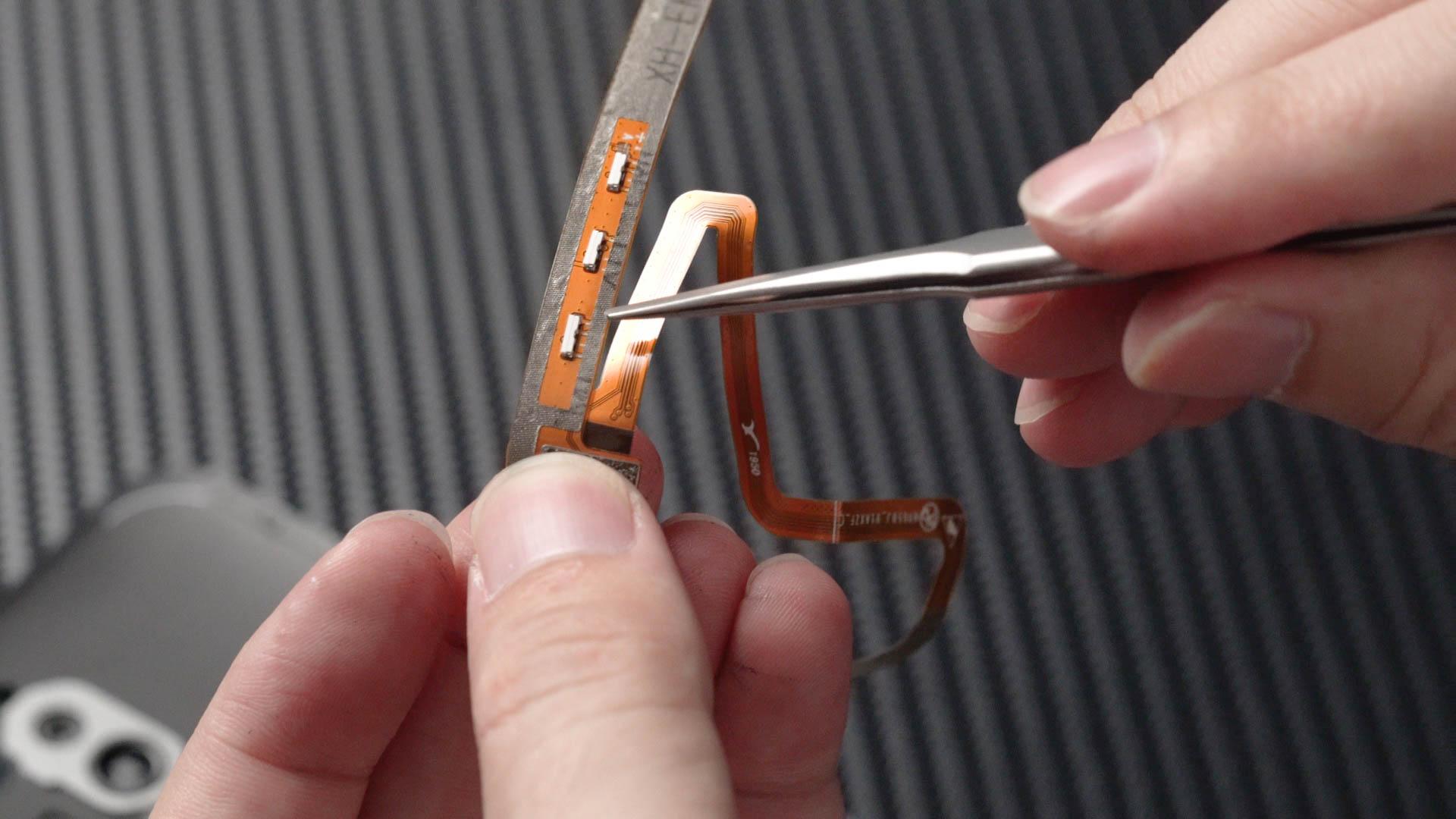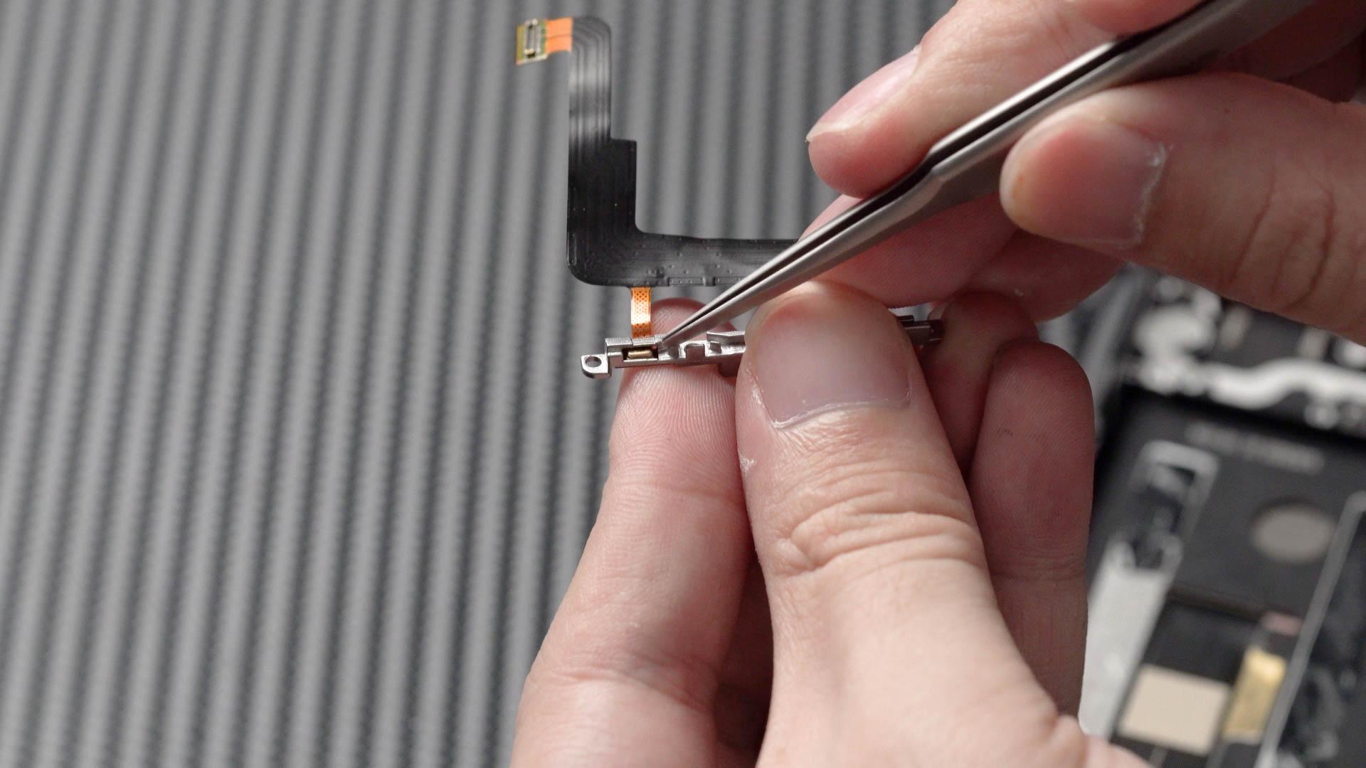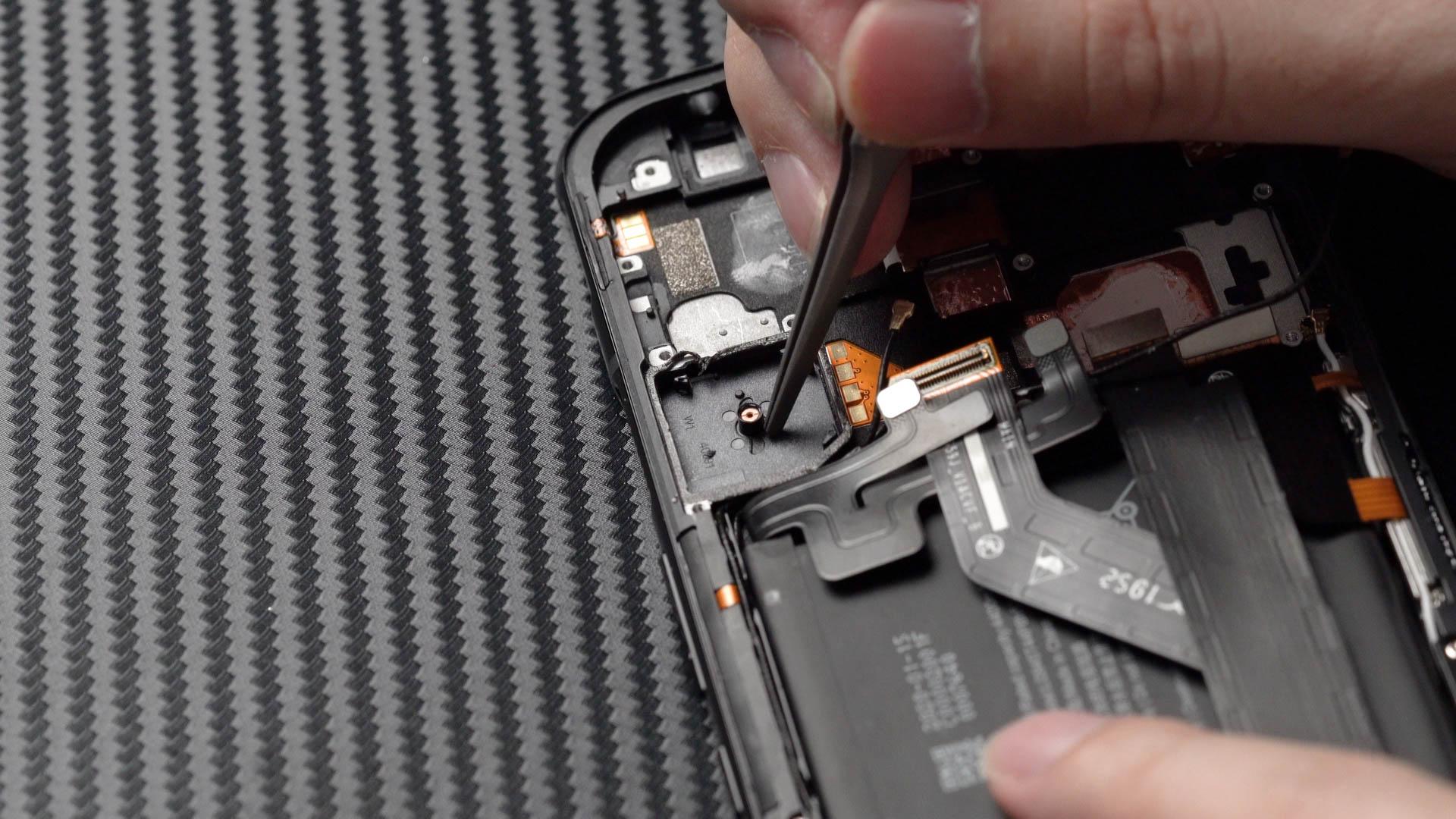 依次挑开主FPC、指纹BTB和RF接口,卸下一颗固定副板的螺丝