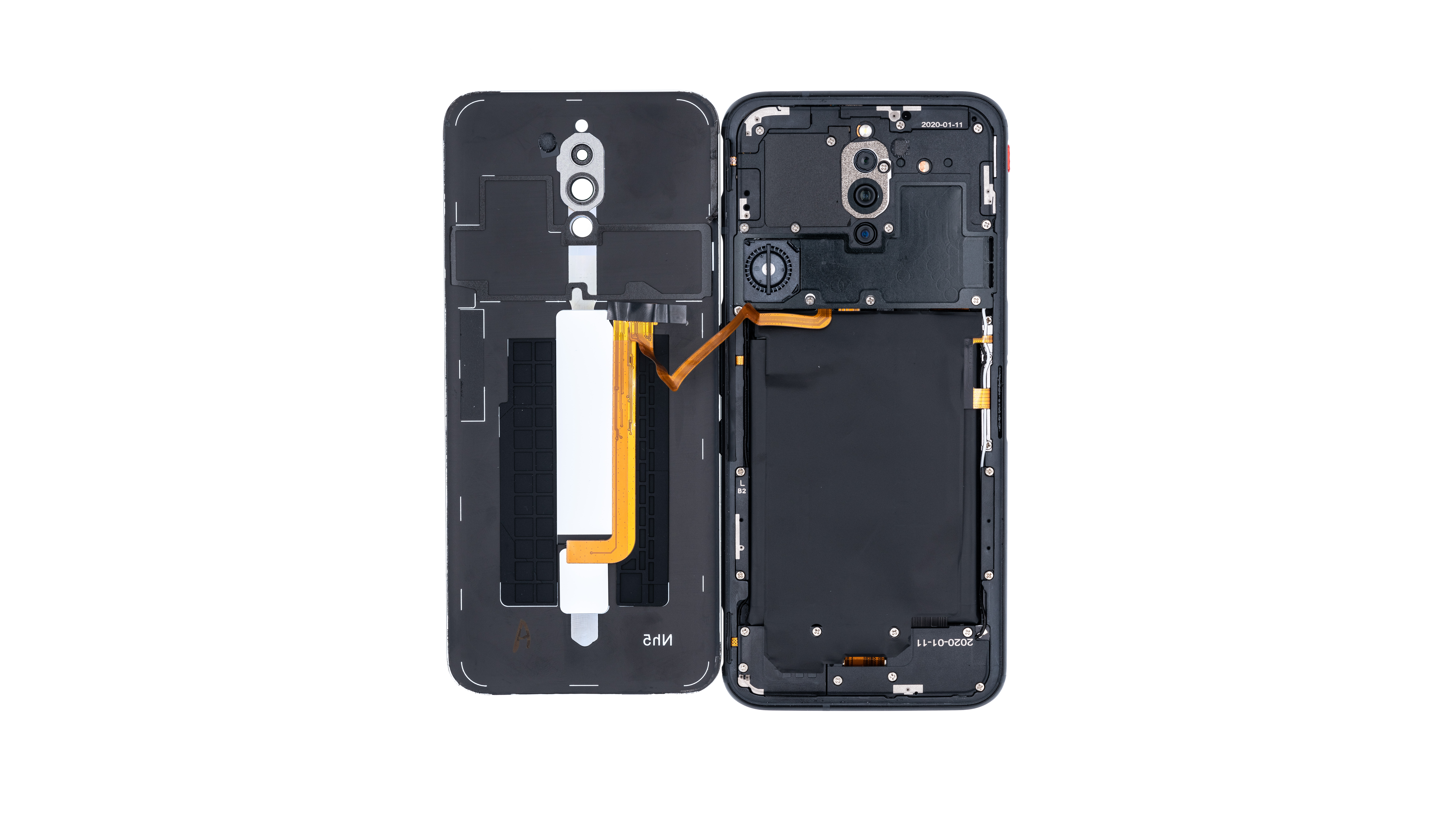 后盖自右向左打开,风扇这回是被固定到了主体部分,而红魔3是在后壳上的。整体还是常见的三段式结构,整体观感除了这根黄色的排线外,还是比较规整简洁的