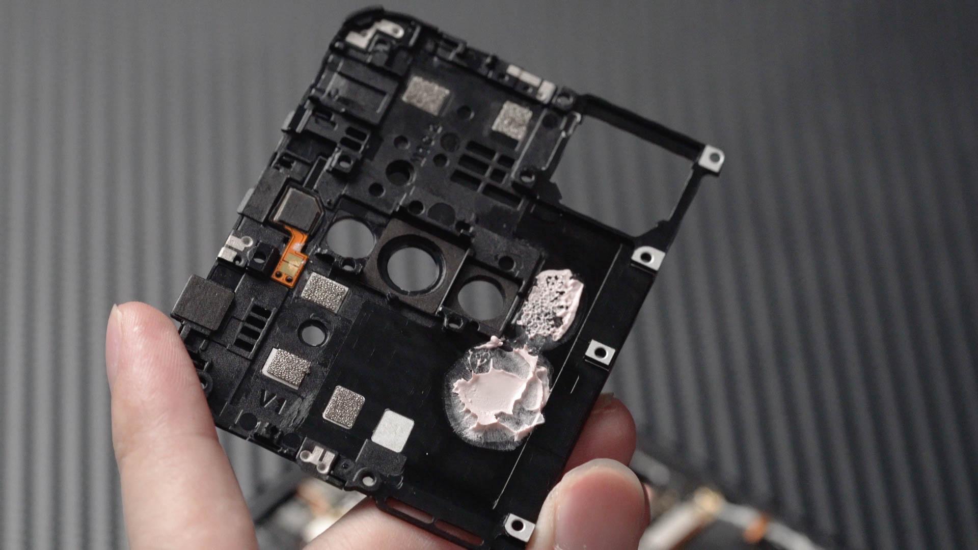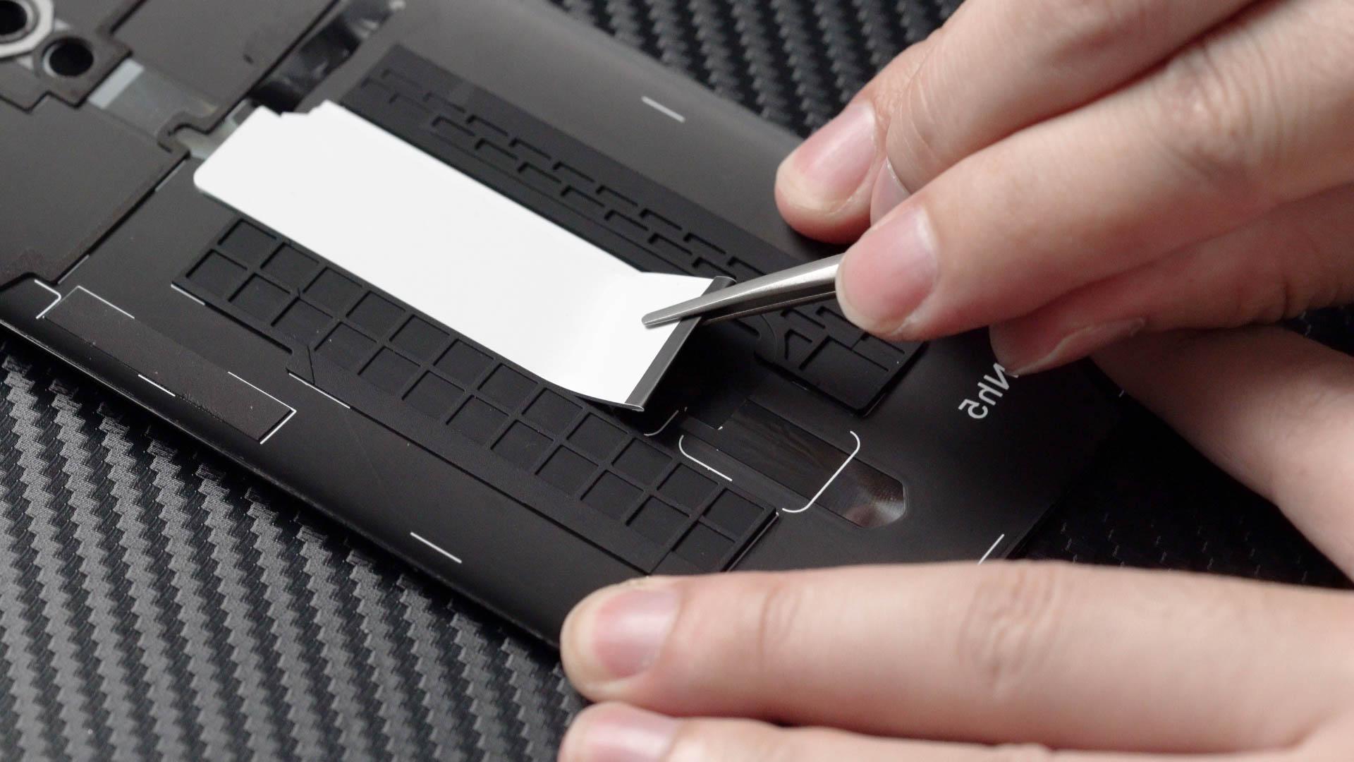 第二步 拆卸后盖,红魔5G不同于上代,改为了常见的三堡包结构。开棺从后盖入手,材质为玻璃,加热垫上90℃加热三分钟后,用吸盘就可以拉开一条缝隙,然后轻轻的插入..拆机片,小心划开四周