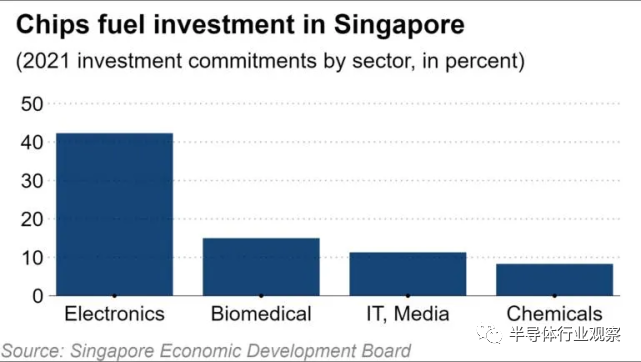 目前,格芯在新加坡的工厂业务占据了公司大约三分之一的营收。格芯在新加坡制造的产品主要是支持汽车、5G移动网络以及一些安全设备的领域。除此之外,它在新加坡还有一个重点产品,就是安全设备,例如由银行所采用的NFC芯片制造。德国制造商Siltronic AG(世创公司)在新加坡建造的300毫米工厂在2021年10月破土动工,以支持紧张的半导体市场的强劲需求,新的晶圆制造厂为其在新加坡的业务注入了30亿新元(22亿美元)。据报道,这项投资将创造600个就业岗位,并使新加坡成为世界上最大的高端基板供应商之一,而高端基板对生产芯片至关重要。目前Siltronic AG在新加坡拥有先进的200 毫米和 300 毫米晶圆工厂。法国的Soitec等其他行业参与者也扩大了在新加坡的业务,该公司投资4.4亿新元(3.26亿美元),计划到2026年,每年生产100万片晶圆。今年2月,联电宣布将目前位于新加坡的300mm晶圆厂(Fab 12i)旁边建造一座新的制造工厂,提供22/28nm工艺。新工厂第一阶段将拥有每月30000片晶圆的产能,预计将于2024年底开始投入生产。今年4月,全球汽车芯片巨头安森美Onsemi将自己在上海部分的全球配送业务迁至新加坡,在汽车界掀起轩然大波。行业厂商将目光重新锁定到了新加坡身上。新加坡在过去一年中公布了数十亿美元的半导体相关投资,并设定了到 2030年将其制造业增长50%的目标。负责吸引外资的新加坡经济发展委员会报告称,2021年设施、设备和机械等新投资承诺的资金,达到118亿新加坡元(87.7亿美元),其中美国公司占67.1%。新加坡“栽下梧桐树”