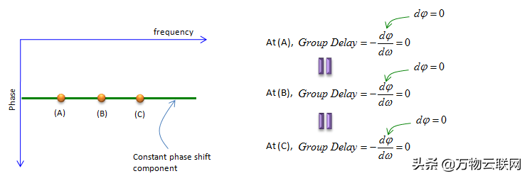 在下面的情况中,您会看到一些非零相位(延迟)值,但所有频率范围内的值都相同。这意味着“频率变化的相变”为零,反过来,它意味着群延迟为零。这是一种想象的情况,你不会在真实器件中看到这种情节。